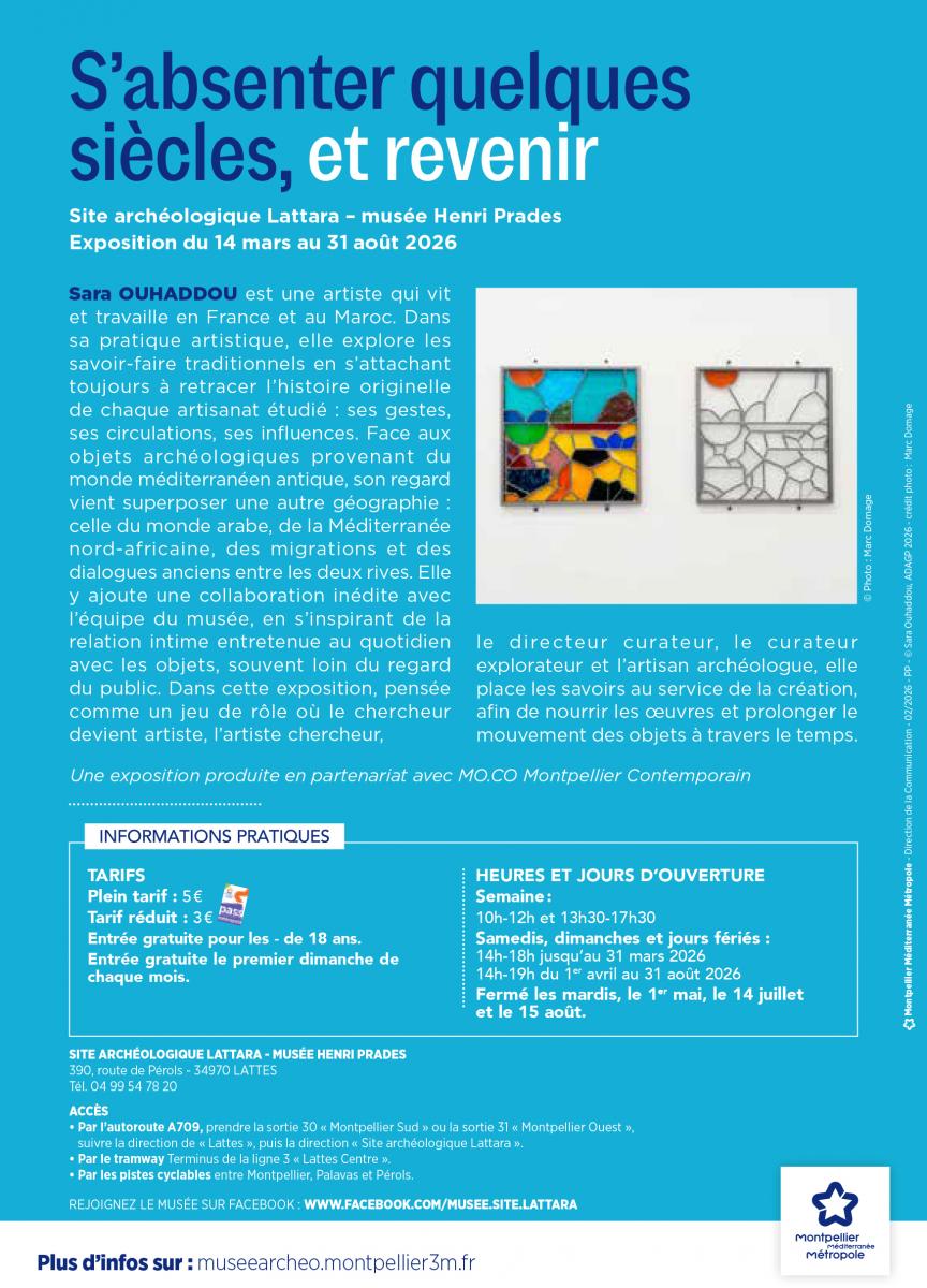 "S'absenter quelques siècles, et revenir" de Sara Ouhaddou, une exposition d'art contemporain en dialogue avec la collection permanente du site archéologique Lattara-musée Henri Prades, du 14 mars au 31 août 2026.