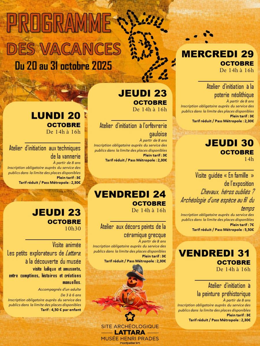 Durant les vacances scolaires, du 20 au 31 octobre 2025, le service des publics du Site archéologique Lattara-musée Henri Prades propose, sur réservation, dans la limite des places disponibles, un programme varié d’ateliers pour le jeune public individuel.